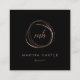 Cartões de visitas pretos em forma quadrada única deixam uma impressão moderna. O lado frontal apresenta um elemento abstrato em dourado falso rosa, rodeando suas iniciais ou monograma em um roteiro de caligrafia moderno. Personalize com dois campos de texto personalizados abaixo para seu nome e título ou nome comercial. Adicione seus detalhes de contato do cheio ao lado inverso. Adequado para qualquer ocupação; exemplo mostrado para cabelos e maquiadores. NOTA: NÃO HÁ FOLHA DE OURO NESTE PRODUTO. O efeito ouro-rosa é criado usando sutis variações de cor que imitam o aspecto da folha.