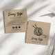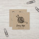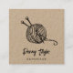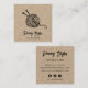 Cartões de visitas de kraft marrom russos para seus negócios feitos à mão, artesanais ou artesanatos apresentam duas linhas de texto personalizado na frente, em caracteres manuscritos de blocos e caracteres de script, com uma ilustração de uma bola de fio com duas agulhas de tricô. Adicione cinco linhas de texto personalizado ao lado inverso em fontes correspondentes. Inclui três ícones de mídia social e um campo para seu nome de usuário.