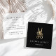 Cartões de visitas quadrados elegantes para penteados apresentam um par de tesouras estilistas em folhas falsas de ouro enfeitadas com flores, sobre um fundo preto rico com duas linhas de texto personalizado em branco. Personalize a parte traseira com os detalhes de contato do cheio.
