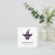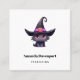 Cartão de visita quadrado com uma ilustração temática divertida do Halloween para amantes de gatos. Um gato preto de olhos grandes vestindo um chapéu de bruxa preta grande com um cinturão roxo rosa ao redor da borda.