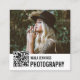 Mostre uma foto favorita desses cartões de visitas quadrados modernos para fotógrafos ou profissionais de fotografia. O Design apresenta duas linhas de texto personalizado abaixo da sua foto, juntamente com um código QR personalizável. Adicione as informações de contato do cheio no verso em letras negras negras negras nítidas e modernas.