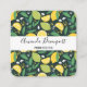 Cartões de visitas com um padrão fofo que apresentam limões amarelos e frutas limões verdes com pedúnculos de folhas sobre fundo verde escuro.
