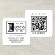 O design quadrado preto e branco moderno e mínimo apresenta o logotipo da sua empresa e o código QR personalizado no verso. Personalize o texto com suas informações comerciais preferidas, como nome comercial, endereço, número de telefone ou site. O texto preto e a cor branca do fundo podem ser alterados.