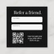 Back: “Refer a friend.” + write-in lines + QR code + short offer text