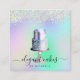 Esta elegante cartão de visita de padaria apresenta uma ilustração do bolo de casamento prateado e iridescente do arco-íris num fundo holográfico falso, com uma borda superior de cintilação falsa prateada. Personalize-o com o seu nome comercial em um script de escrita manual preto, com alternâncias no início e no fim, e as informações de contato em fontes de sans pretas. (Para guardar as hastes, substitua apenas as letras nesses campos de texto, deixando os símbolos no lugar.)