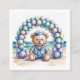 Uma ilustração de aquarela esbranquiçada retrata uma grande arca construída a partir de balões azuis macios, poeirentos, criando uma atmosfera celebratória e encantadora. Centrado no arco do balão, encontra-se um grande ursinho de pelúcia, afável, vestindo uma charmosa roupa de marinheiro azul e desportivando um sorriso largo e amigável que transmite pura alegria - "Bem-vindo ao Partido". O urso está posicionado numa praia arenosa primitiva com areia branca brilhante, inclinando-se suavemente em direção a um calmo oceano turquesa ao fundo. Luz do sol suave e difusa ilumina a cena, lançando um brilho quente nos balões, ursinho de pelúcia, e a praia convidativa, promovendo um senso de alegria gentil e charme lúdico.