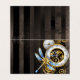 Marcações antigas com engrenagens de ouro e latão, decoradas com libélula mecânica sobre fundo castanho e listrado. Steampunk.