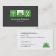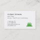 Um cartão de visita moderno e profissional com trio caixas de ícones de silhueta tocados, um gramado e tesouras de cobertura. Perfeito para empresas que fornecem serviços de corte e manutenção de relva, controlo de ervas daninhas e paisagens. Personalize com suas informações comerciais nos modelos de texto fornecidos. Paleta de cores verde, branco e preto.