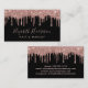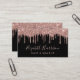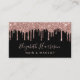 Faça uma boa impressão com este cartão de visita preto chic e elegante com gotas de brilho de falso ouro rosa e o seu nome num roteiro de tendências. Perfeito para salões de beleza, maquiadores, cabeleireiros e estéticos.