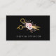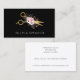 Este cartão de visita para profissionais capilares apresenta uma tesoura de ouro elegante e um buquê de delicadas flores cor-de-rosa, contra um fundo preto elegante, criando uma representação visualmente espantosa da sua habilidade e talento.