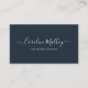 Design de cartão de visita simples e elegante apresenta seu nome ou nome comercial em uma tipografia de script branco moderna, escrita à mão, sobre um fundo azul de marinho nítido. Adicione uma linha adicional de texto abaixo em caracteres limpos e modernos de bloqueio para sua ocupação ou título. Personalize o lado inverso com seus detalhes de contato. Uma escolha técnica e profissional em marinho clássico e branco para qualquer ocupação.