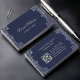 Um cartão de visita elegante que tem bordas de vintagem esquerda e direita com antigas decorações de prata falsa. O fundo é marinho azul. Na frente, o nome" é escrito em um roteiro caligráfico elegante. Todo o texto é cinza de prata, como as fronteiras. Tem um código QR na parte de trás, à esquerda. As elegantes decorações de ouro são de um vintage cobrir de livro francês do final do século 19, agora em dominio público, de Nicolas Denis Derome (1731-1790), conhecido como Derome le Jeune, para um livro intitulado "Gaspar Epistol".