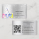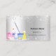 Um cartão de visita elegante e glamouroso sobre um fundo falso, de aspecto prateado, decorado com pó falso de brilho na frente e equipamento de limpeza. Personalize e adicione seu nome, informações de contato de texto e seu próprio código QR ao seu endereço de site. Ícones do Facebook e Instagram. Excluir se não desejar.