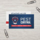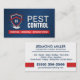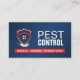 Um design de cartão de visita limpo e profissional para técnicos de controle de pragas e pequenas empresas de extermínio. A frente apresenta um gráfico de escudo vermelho e azul ousado com um motivo de inseto sutil, combinado com uma tipografia forte:
