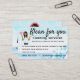 Cartão de visita com azulejos azuis-claros brancos e fundo de bolhas com a fotografia de uma senhora de limpeza com tom de pele de caramelo com cabelo castanho e olhos castanhos vestidos numa t-shirt branca e jeans que seguram ferramentas de limpeza e acessórios cor-de-rosa. Muito espaço para editar suas informações de negócios e escrever slogans e muito mais. Faça sua própria cartão de visita personalizada.