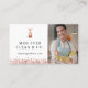 Cartões de visita de serviços modernos e profissionais de limpeza de fotos com um design e layout minimalistas. Personalize com seu retrato profissional junto com o nome e site da sua empresa. Um simples logotipo de frasco de spray de rosa dourada falsa é adicionado sobre o nome da empresa, junto com o design de brilho rosa dourado falso. O verso apresenta um código QR para você substituir, junto com nome, cargo, informações de contato e identificador de rede social. Todas as ilustrações são obras de arte originais desenhadas à mão pela Moodthology Papery. Cartão de visita perfeito para empresas de limpeza residencial, serviços de empregada doméstica, etc.