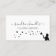 Cartões de visitas profissionais de limpeza com um fundo branco clássico, sillohette preto de uma figura-dama, com um duster e uma aspersão de estrelas, nome e negócios. Ao contrário, há um modelo contemporâneo que é fácil de personalizar.