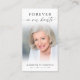 Simple memorial prayer card featuring a cherished photo of your loved one and the sentiment Forever in Our Hearts in elegant calligraphy script typography on the front and a suggested prayer or your custom text and optional cross on the back. These cards provide guests with a personal reminder of the one who has passed—something beautiful they can carry or keep close.