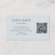 Cute and elegant business card with a blue bow on one side and a QR code on the back of the card. Illustrated and designed by Patricia Alvarez.