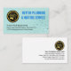 Cover features a blue water drops design. At the top is the business name in blue with a gold home plumbing & heating logo you can use. Near the base is the contact details.