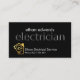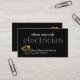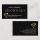 Um cobrir preto apresenta uma sinalização "eletricista" translúcida perto do centro da placa. No topo está seu nome prestigioso com o logotipo do circuito doméstico da lâmpada de ouro que você pode usar na base junto ao nome comercial e aos detalhes de contato. No verso, os detalhes da placa estão à direita com o logotipo dourado no topo. Seguem-se o seu nome prestigiado, os contatos e uma opção de slogan para divulgar seus serviços. Este é um cartão criativo para os eletricistas usarem.