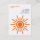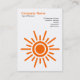 Um modelo de cartão de negócios com símbolo do Sol. Nome da empresa, tipo de negócio e endereço na frente com nome, cargo, telefonia, web e endereços de e-mail no verso, com o mesmo layout.