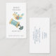 Um cartão de visita de costureira balnear com ilustração de uma colher de rosca e almofada de pinos. Ferramentas de comércio, para costureira, alfaiate ou desenhador de moda. Cartão de visita vertical. Você pode alterar o texto no slogan abaixo do título ou excluir. Você pode fazer uma pequena lista de seus principais serviços como design de roupas, alterações, reparos.