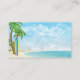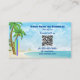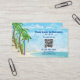 Este cartão de visita de código QR apresenta uma prancha de surfe em uma praia tropical com palmeiras. A água é um belo azul e há nuvens espalhadas no céu. - por The Beach Bum