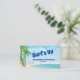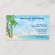 Este cartão de visita de surfe do Up mostra uma prancha de surfe em uma praia tropical com palmeiras. A água é um belo azul e há nuvens espalhadas no céu. -