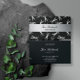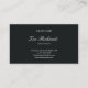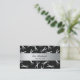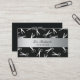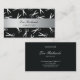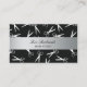 Cartão de visita de cabelos estilista em preto-e-branco e prata. Um padrão de tesoura prateada contra fundo preto, com um rótulo prateado com seu nome e título.