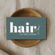 Modelo de cartão de negócios moderno totalmente personalizável com fontes ousadas, fundo verde e ícone de tesoura prateada falsa. Perfeito para salão de cabelo, cabeleireiros.