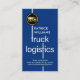 Um cobrir azul escuro é acentuado pelo movimento criativo de "logística de caminhões" perto do centro do cartão. A carta-t alongada representa estradas rodoviárias. No topo está um logotipo de caminhão dourado que você pode usar com seu nome prestigiado logo abaixo. Na base estão os contatos. No verso, em um cobrir branco, no topo está o logotipo do caminhão de ouro seguido do seu nome prestigioso, dos detalhes de contato e de uma opção de slogan. Um cartão para caminhar temas de transporte.