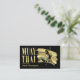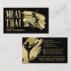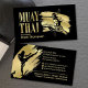 Um dramático design de negócios Muay Thai em preto e ouro, mostrando uma poderosa ilustração de caça contra texturas ousadas de pincel. A frente destaca o título Muay Thai com uma forte tipografia, enquanto a parte de trás inclui uma silhueta surpreendente junto com detalhes de treinadores, informações de contato e ofertas de classe. Uma opção de destaque para treinadores Muay Thai, treinadores pessoais e profissionais de combate que querem um olhar moderno e de alto impacto.