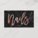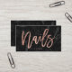 Uma cartão de visita elegante, moderna, na moda com letra na moda unhas, estilo de tipografia de letras manuais em folha de ouro falso rosa, num fundo de mármore preto tenso e elegante.