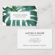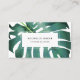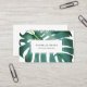 design de cartão de visita elegante e moderno, com ilustração de uma folha de monstera verde ao fundo.