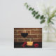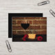 Esta carteira de negociação artística apresenta uma imagem simples de um copo de vinho, uma placa de queijo e três flores vermelhas contra uma parede de tijolos vermelho-rústicos.