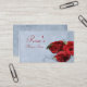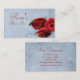 Design de modelo de cartão de negócios de compro azul de flor em cascata vintage elegante com rolagens de canto decorativo no canto superior e inferior com uma foto de três rosas vermelhas no canto inferior. O fundo recebe um aplicativo texturizado de granulado para uma aparência antiga de papel. Esta design vem em vários planos feitos. Esta design também vem em muitos outros produtos de papelaria para se adequar a todas as suas necessidades de casamento.