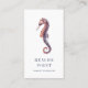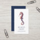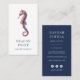 Os cartões de visitas verticais elegantes para sua empresa costeira apresentam uma ilustração do cavalo marinho a aquarela com seu nome e/ou nome comercial abaixo. Personalize o reverso com suas informações de contato, incluindo três ícones de mídia social e um campo modelo para seu nome de usuário de mídia social, em branco a azul marinho.