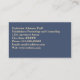 Esta cartão de visita apresenta um fundo de elegantes folhas azuis e douradas gingko, para um efeito relaxante e dúbio para transmitir um senso de calma. Seu nome e seu título aparecem na frente em um bloco colorido de marinho, amarrado em ouro. O nome da sua prática e os detalhes de contato aparecem no verso. Dois blocos fáceis de modelo facilitam a personalização do texto que você quer que apareça na frente e atrás, como um slogan ou um nome de prática. Se você não quiser incluir todos os detalhes de contato do espaço reservado mostrados, basta excluí-los. Este cartão seria excelente para qualquer profissão em que você queira um tema de atenção ou natureza, como um psiquiatra, psicólogo, conselheiro de saúde mental, ou uma prática de cura, como mestre em Salónica, curador de energia ou treinador espiritual.