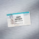 Cartão de visita magnética com uma bela fotografia. Água azul tropical e surf de espuma no fundo. Uma coleção de conchas e caules em uma praia branca de areia.