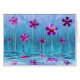 Um desenho digital de lindas flores roxas estilizadas com centros vermelhos brilhantes. Estão a espreitar-vos com instabilidade a partir da erva alta ao lado de uma piscina de água ripada.