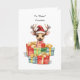 O veado veste um chapéu de Papai Noel, exuberando uma elegância divertida que captura o espírito da estação. Ao redor do cervo estão montes de presentes brilhantemente envoltos, formando uma cascata colorida de alegria e entusiasmo. Cartão perfeito para enviar seus primos nesta temporada de férias.