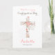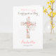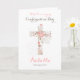Placa dobrada elegante para confirmação com uma cruz floral rosa pincelada em um pano de fundo branco. Personalizar frente com texto, nome e data...dentro com verso e texto bíblia.