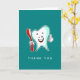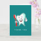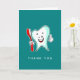 Cartões de agradecimentos com uma ilustração de um estilo de desenho animado grande dente branco sorrindo alegremente segurando uma escova de dente vermelha e dando aos polegares uma placa para cima. Fundo verde.