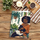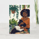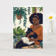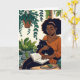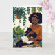Mulher afro-americana sentando lendo livros cercados por plantas com um gatinho dormindo no colo. Ai arte feita no estilo de pop de quadrinhos. Desejando a um amigo ou membro da família um aniversário feliz, mas relaxante.