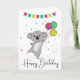 Saudação de aniversário Feliz Aniversário com balões e coala para o aniversário das crianças. Um cartão divertido e colorido para o aniversário de uma criança. Para amigos que amam coalas.
