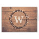 Design de monograma para Natal, com coroa e decoração de neve sobre fundo de madeira rústica