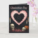 Um grande coração ornamentado montado em um pedestal como se estivesse em exibição. Aninhado dentro desse coração há um denso aglomerado de rosas negras aveludadas, suas pétalas em camadas formando um segundo coração mais escuro no centro da imagem. O contraste entre o fundo rosa suave e as flores escuras parece ao mesmo tempo romântico e estranhamente pesaroso. Acima do coração, as palavras “Dia dos Ghoulentinos” estão escritas em uma fonte gótica. Parte cartão de Dia dos Namorados e parte sala de estar assombrada. Ao redor da base da peça central, velas queimam com cera pingando por seus suportes. Dois crânios humanos sentam-se em silenciosa companhia, enquanto um ornamento esculpido adiciona um toque sazonal divertido.