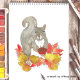 Deseje um Feliz Dia de Ação de Graças aos amigos e familiares ou simplesmente envie um cartão de Outono com este original adorável de aquarela apresentando um esquilo cinza doce segurando uma torta de noz pecã miniatura (sua favorita!) e sentado em uma pilha de folhas coloridas de Outono.