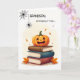 Dê uma risada ao seu neto neste Halloween com um cartão engraçado que é perfeito para qualquer idade — seja ele um garotinho, adolescente, adolescente ou adulto. Um belo jack-o-lanterno beams de uma pilha de livros enquanto uma aranha brincalhona cai de sua teia, amarrando-se na mensagem reluzente "Basta cair". Uma mistura festiva de bobo assustador, este design bonitinho de Halloween é uma maneira divertida de enviar amor, riso e alegria de Halloween para seu neto, perto ou longe.